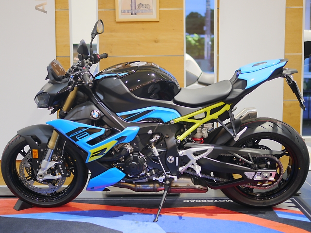 ■納期お問合せ下さい!■軽量&高度な電子制御装備によりスポーティかつ安全なライディングが可能な新型S1000R■ブルーファイア/ムジェロイエローのS1000Rはダイナミック、そして際立つ美しさ。リアフレームのムジェロイエローはブルーファイアのストライプとともに魅力的なコントラストを生み出しています■ABSPro(コーナリングABS)、DTC(トラクションコントロール)、ShiftAssistantPro、6軸IMUを活用したライディングモードProなど、スポーツ走行と安全性を両立する電子制御が充実しています■999cc並列4気筒エンジンから最大出力170PS/11,000rpm、最大トルク114Nm/9,250rpmを発揮。街乗りからワインディングでの俊敏さと扱いやすさも兼ね備えています。(写真のシングルシートカウル・アルミ削り出しブレーキ&クラッチレバーはオプションです)