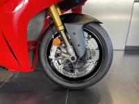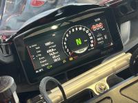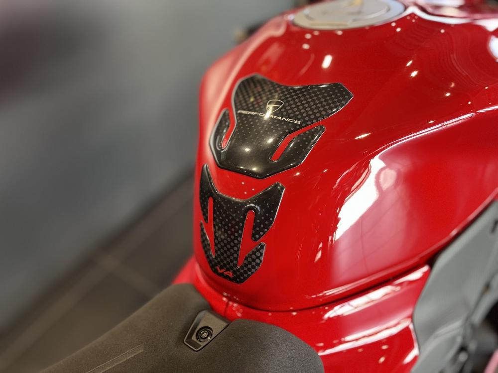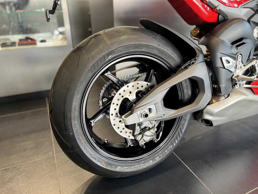 2025年式パニガーレv4s。前後オーリンズ製電子制御サスペンション。リアのスイングアームが、これまでの片持ち式から、両持ち式になり、トラクション性能を向上させながら、全体の軽量化。メーターパネルは、6.9インチの大画面フルカラー液晶がされた。