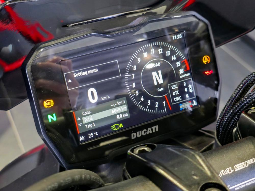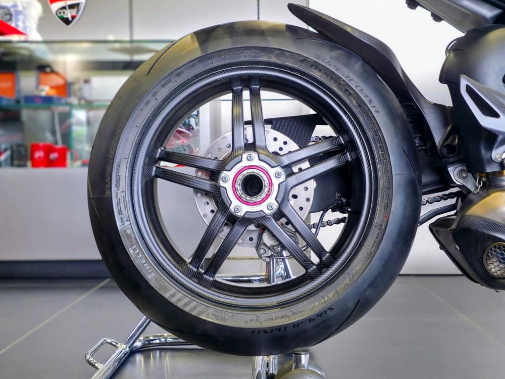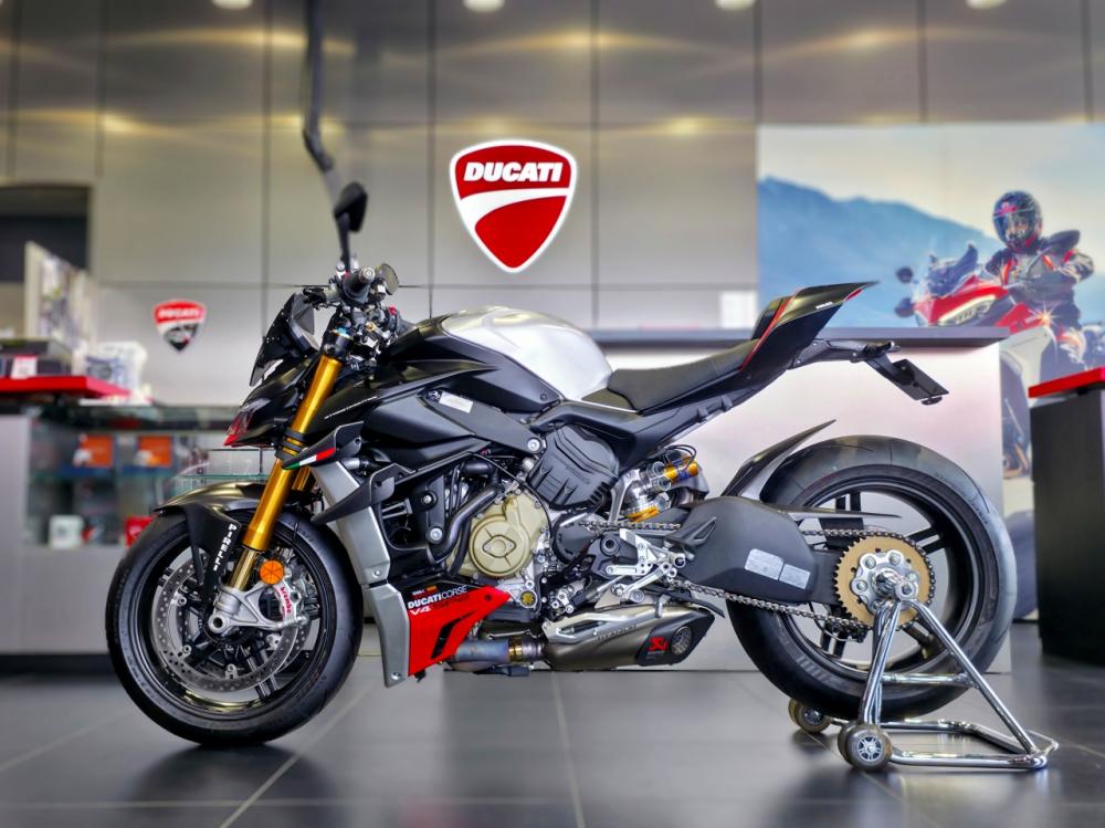 AKRAPOVIC製マフラ、カーボンパーツ多数装備!マットブラックを基調にしたドゥカティコルセのウインターテストカラーを採用。ストリートファイターシリーズの最上位モデル。